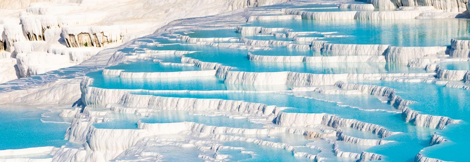 Pequeno-almoço e continuação para Pamukkale (420km), património mundial da UNESCO. Popularmente conhecida como o "Castelo de Algodão", Pamukkale apresenta-nos uma deslumbrante paisagem de cascatas brancas de calcário formadas por fontes minerais. Após o almoço num restaurante local, explore os maravilhosos travertinos brancos e as ruínas da vizinha cidade grega de Hierápolis, fundada em 190 a.C. Chegada ao hotel de Pamukkale. Jantar no hotel.